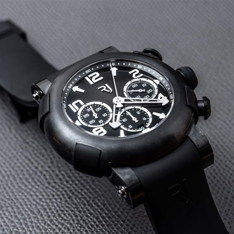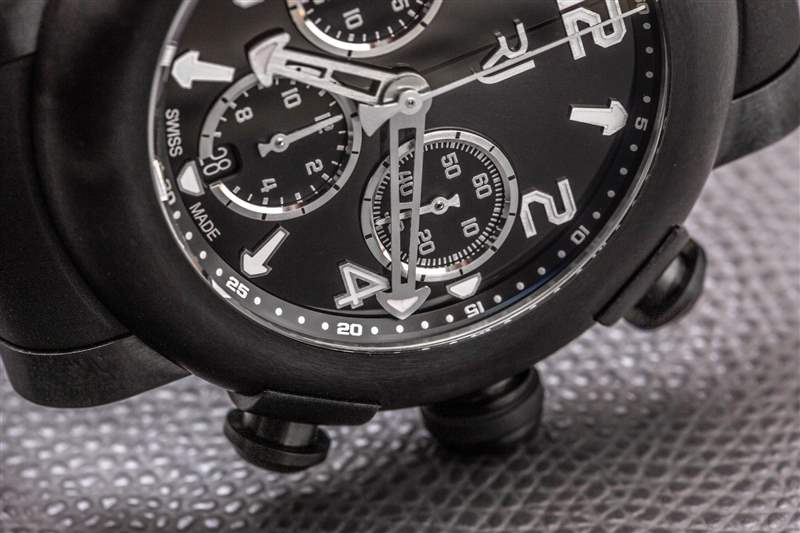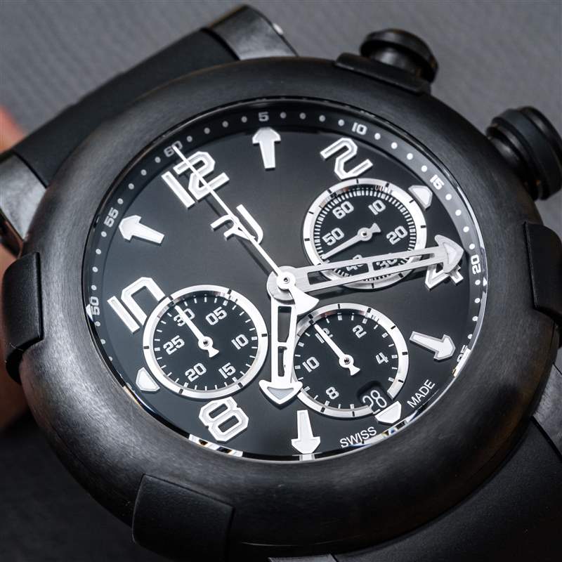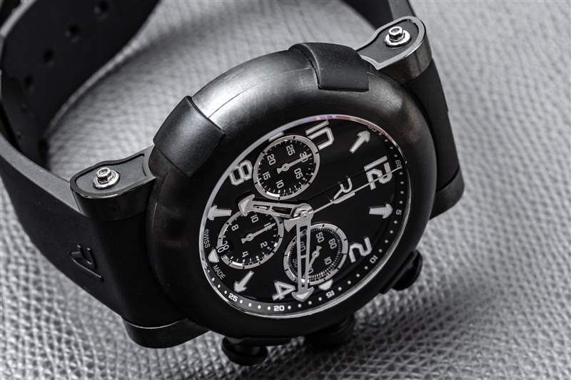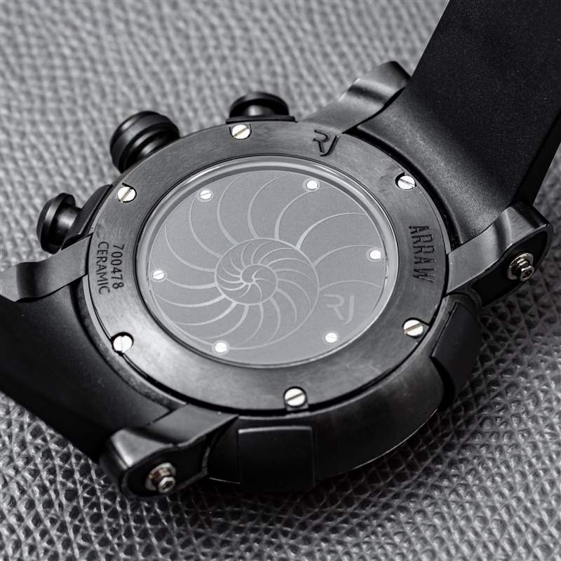 顧名思義,Arraw Marine Ceramic 采用黑色陶瓷作為主要表殼材料。RJ 做得很好,使陶瓷具有水平拉絲飾面,實(shí)際上使它看起來像金屬。如果你告訴別人這是一塊黑色涂層的金屬表,他們會(huì)相信你的。這意味著您可以獲得具有陶瓷耐刮擦性的金屬手表。其他表殼材料包括一些金屬以及橡膠中的“RJ 保險(xiǎn)杠”,這些橡膠保險(xiǎn)杠來自一些前 Romain Jerome 手表表盤上的“X”形狀。