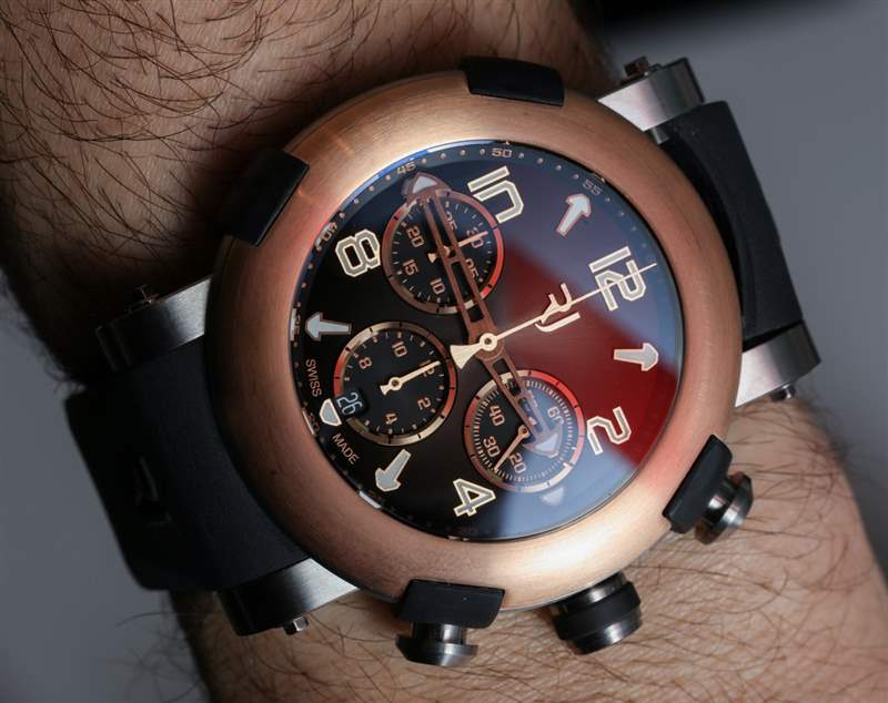 有 Romain Jerome 經(jīng)驗(yàn)的人在將 Arraw 戴在手腕上時(shí)可能會(huì)發(fā)現(xiàn)的第一件事是,表殼形狀與舊款非常相似,但更薄且戴在手腕上更舒適。表殼寬 45 毫米,厚約 15 毫米,表耳到表耳的距離約為 55 毫米(表殼防水深度為 100 米)。這些不是小手表的尺寸,但請(qǐng)注意,這比以前更小,更耐磨。對(duì)我來說唯一的問題是,從本質(zhì)上講,表耳設(shè)計(jì)意味著較小的手腕會(huì)有較長(zhǎng)的表耳伸出手腕。