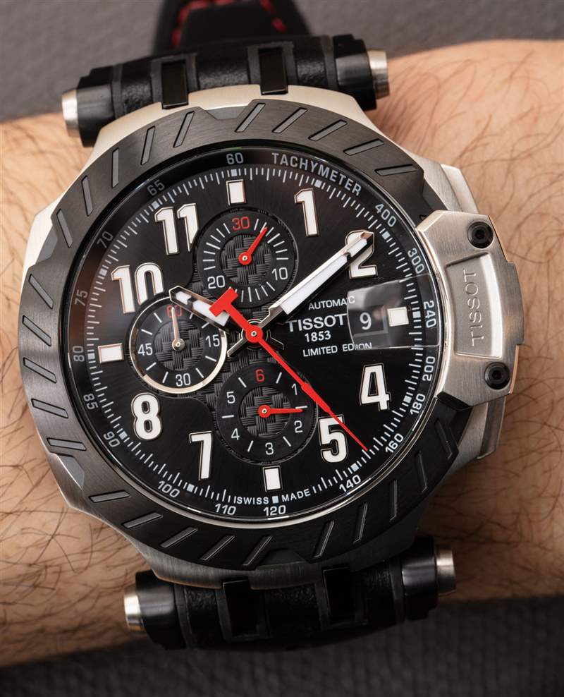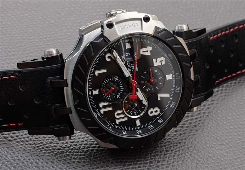 22 毫米寬的表帶和整體寬大的比例讓 T-Race 自動計時碼表感覺很大,但可移動的表耳和高品質(zhì)的橡膠表帶使其佩戴舒適,不會在手腕上漂浮。表殼本身防水深度達 100 米,由鋼制成,表殼的某些部分(例如中間)帶有啞光黑色 PVD ??涂層。表冠和按鈕周圍的細節(jié)很好,整體貼合度和光潔度都很好。