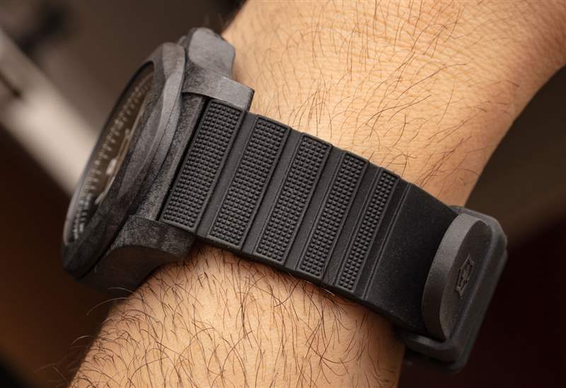 附在表殼上的是一條 21 毫米寬的天然橡膠表帶,它的一些部分帶有模仿 Alox 風(fēng)格表盤的圖案。表帶很好,但我不喜歡它的某些元素。首先,我認(rèn)為表帶太厚了,我覺得如果它遠(yuǎn)離表殼的厚度進(jìn)一步變細(xì)會更舒服。然后,您有鋼制展開式表扣,這似乎使表帶感覺更加笨重,并且其表面處理與手表上的任何其他表面處理都不匹配,除了機(jī)芯。我猜到 Victorinox Swiss Army 至少會使用匹配的黑色展開器。就個人而言,我認(rèn)為一些有進(jìn)取心的 INOX Carbon Mechanical 擁有者會將手表放在不同的表帶上,并真正享受這種體驗。請注意,21 毫米寬的肩帶很少見。