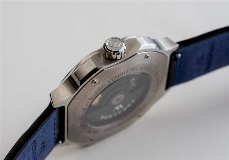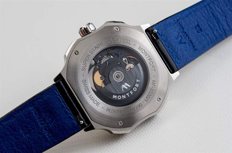 說到表帶,Montfort 使用了一條漂亮的意大利制造的絎縫黑色皮革表帶,內(nèi)側(cè)帶有藍(lán)色(在這款手表上)Lorica 襯里。回到這個(gè)案例,我發(fā)現(xiàn)它做工精良,而且看起來很有趣。雖然案例風(fēng)格當(dāng)然不適合所有人,但我相信沒有人可以指責(zé)它很無聊。雖然我佩戴這款手表的時(shí)間不長,但我相信 Strata 表殼設(shè)計(jì)肯定會(huì)隨著時(shí)間的推移而成長。表殼進(jìn)一步防水 100 米,并在表盤上具有 AR 涂層藍(lán)寶石水晶。另一個(gè)藍(lán)寶石水晶放置在手表后部顯示的機(jī)芯上方。