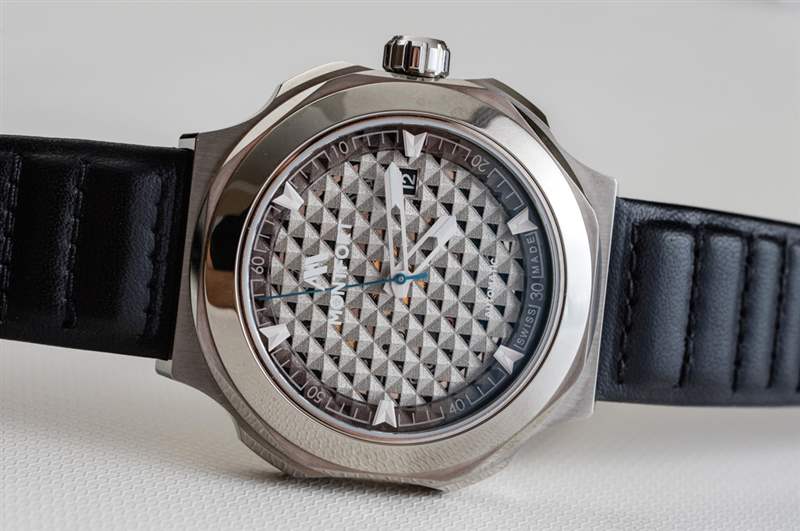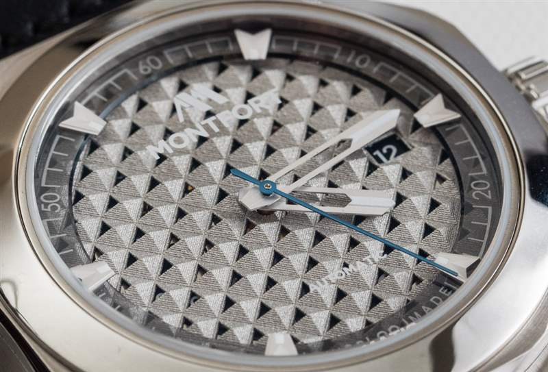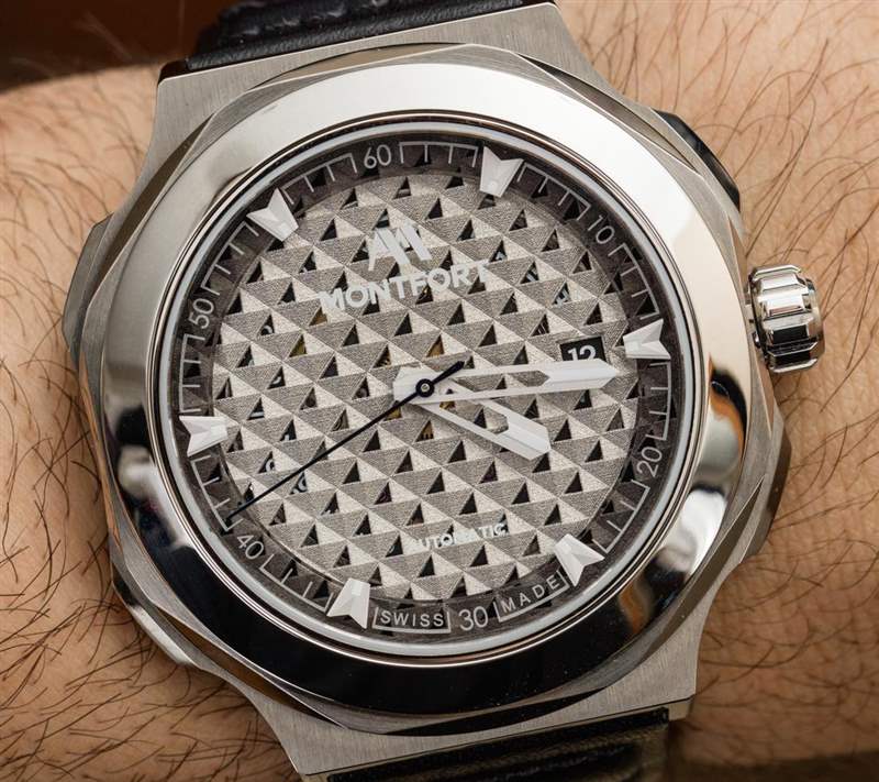 Montfort Strata James 的表盤有很多話要說,因?yàn)樗鞘直韮r(jià)值主張的重要組成部分。Montfort 自豪地宣稱這是一款 3D 打印的金屬表盤——實(shí)現(xiàn)了傳統(tǒng)表盤生產(chǎn)技術(shù)無法達(dá)到的精度。我不會(huì)否認(rèn)這一點(diǎn)。主表盤有一種巴黎釘釘重復(fù)三角形圖案,看起來很酷。廣告訊息廣告信息結(jié)束