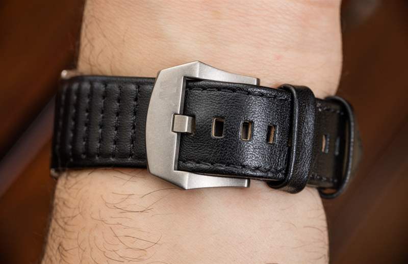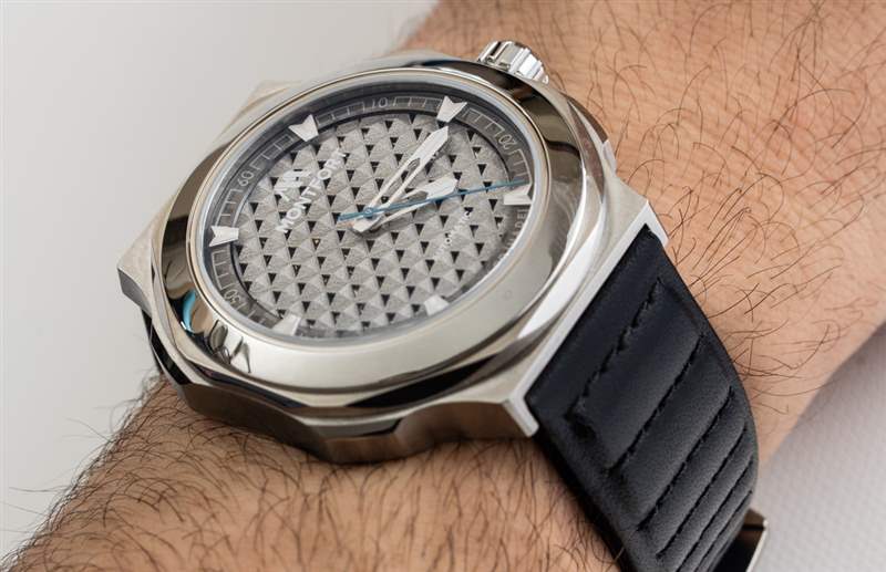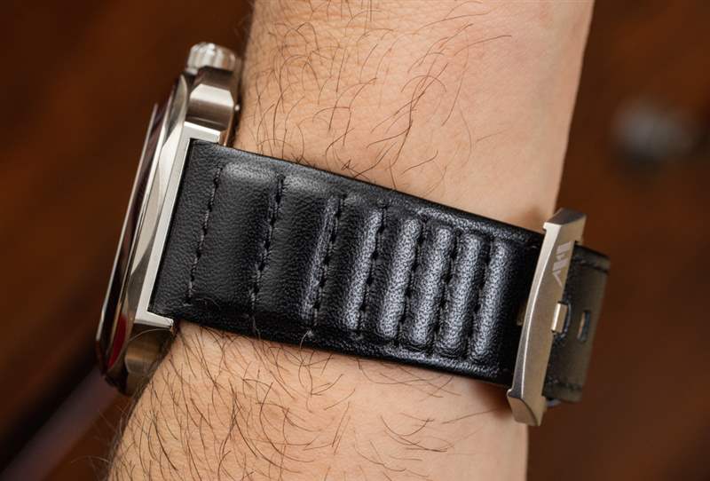 Montfort 自豪地用“超級(jí)不銹鋼”制作 Strata 的 44 毫米寬表殼。這是他們對一種特殊硬化鋼的名稱,這種鋼的表面密度比其他標(biāo)準(zhǔn)鋼表更高。實(shí)際結(jié)果是表殼比類似的鋼表更耐刮擦。表殼的磨損比它可能暗示的 44 毫米寬尺寸要小一些,這是因?yàn)樗暮穸葎倓偝^ 10 毫米,以及相對較短的(寬度)47 毫米的凸耳到凸耳的距離。此外,由于表耳的樣式,折疊的地方?jīng)]有長長的“角”伸出。