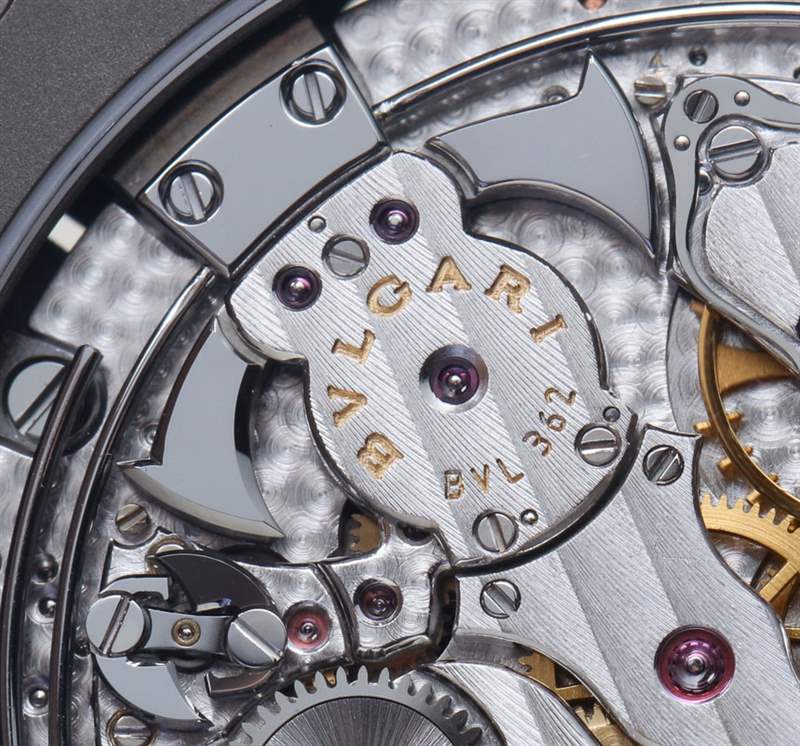寶格麗 (Bulgari) 機芯 BVL 362 采用精美的手工打磨,頻率為 3 赫茲(21,600 次/小時),動力儲存為 42 小時。它提供帶小秒針和三問報時裝置的時間,機芯后部可見音錘和音簧。在我看來,唯一缺少的就是動力儲存指示器——原裝寶格麗 Octo Finissimo 手表所具有的功能。我確信這可以通過增加那么多的額外厚度來包括在內。請記住,寶格麗在擁有世界上最薄的機芯厚度時僅擊敗江詩丹頓約 0.1 毫米。實際上,那是之前的江詩丹頓三問表,其機芯厚度僅為 3.28 毫米。