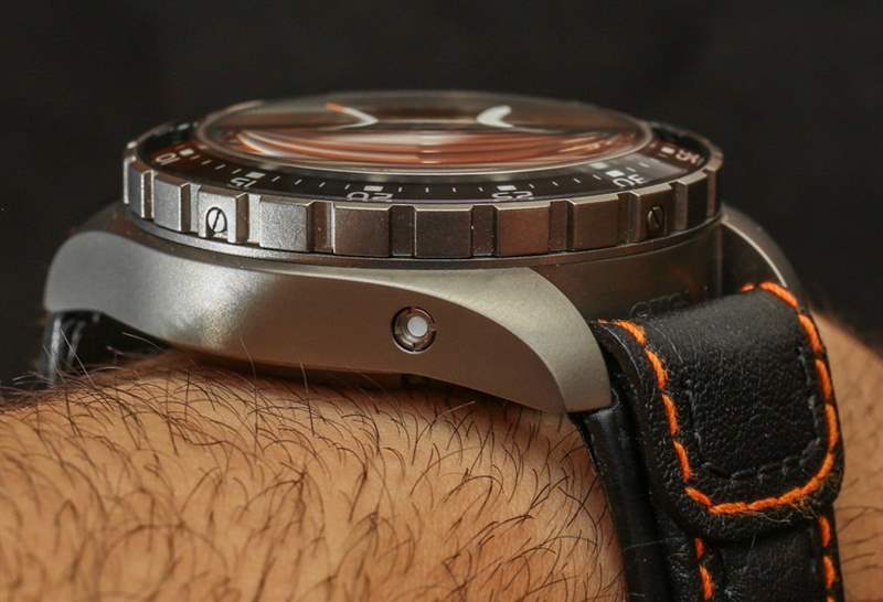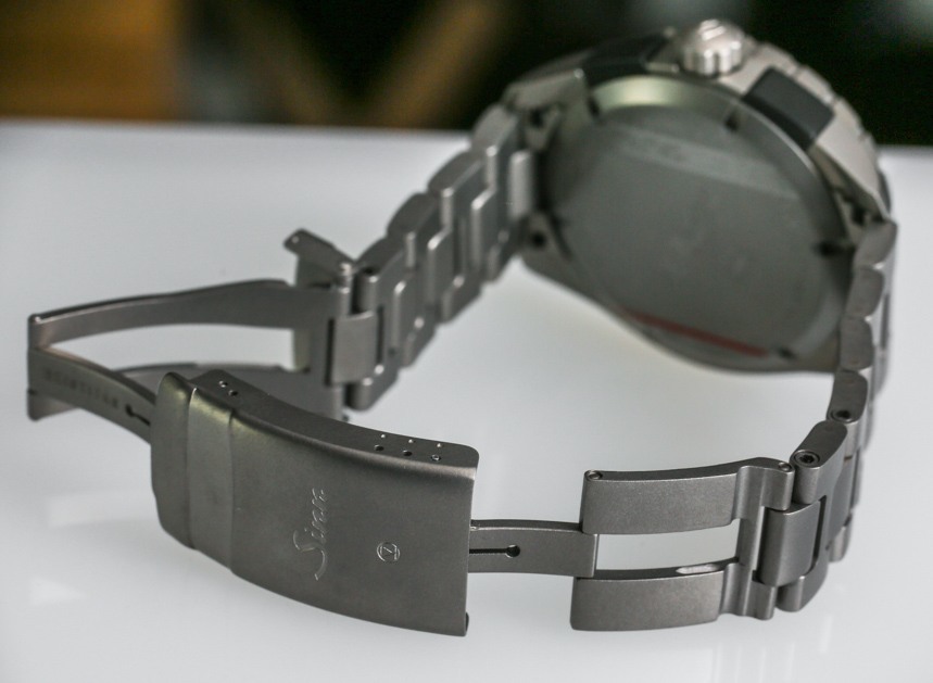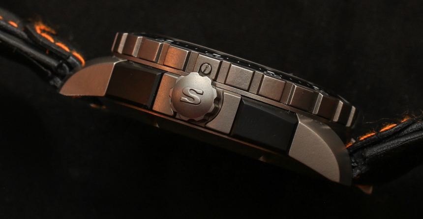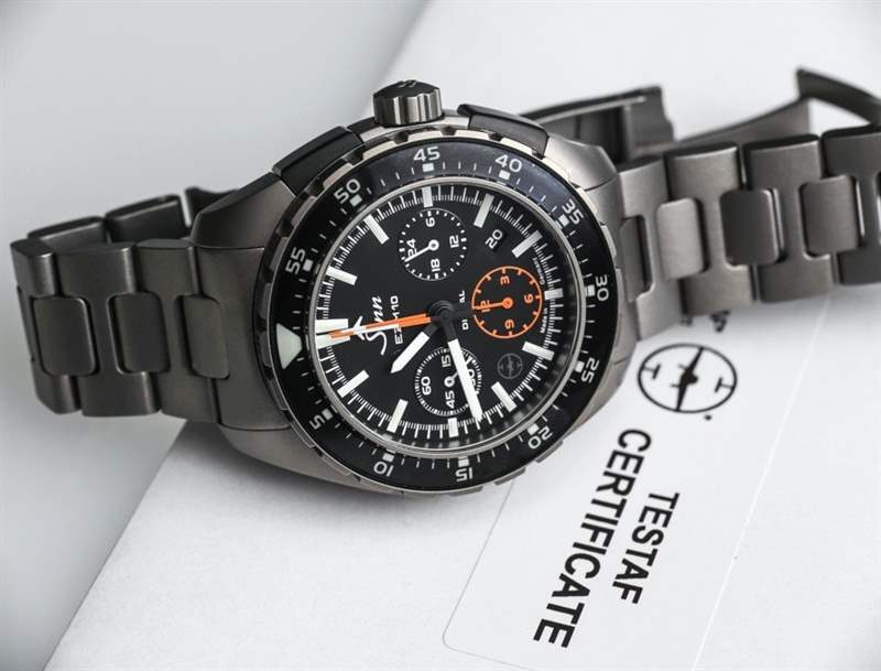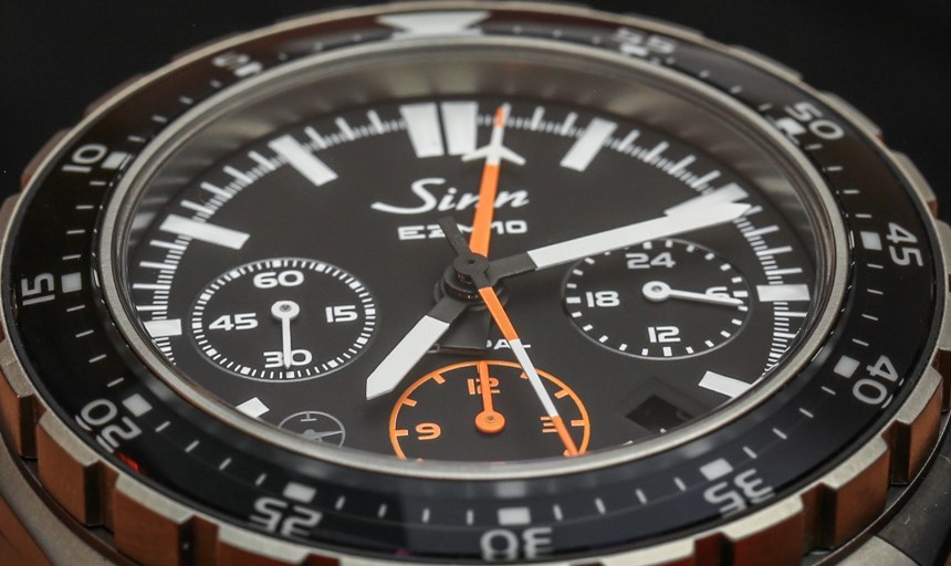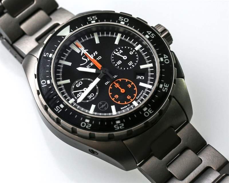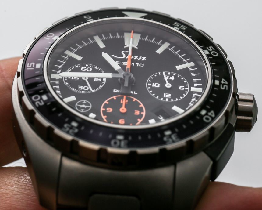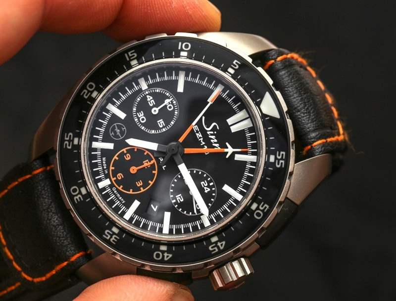 您還會(huì)注意到嵌入式計(jì)時(shí)按鈕設(shè)計(jì)。這是設(shè)計(jì)中比較有爭議的元素之一,但我碰巧喜歡它。每個(gè)人都喜歡齊平的計(jì)時(shí)碼表按鈕,但并不是每個(gè)人都喜歡 Sinn 決定將它們制成黑色。我不是 100% 知道他們這樣做的原因,但我的推測(cè)是,這是為了幫助提醒佩戴者他們?cè)谀抢铩_@聽起來可能很愚蠢,但我認(rèn)為好的工具設(shè)計(jì)意味著沒有操作按鈕或其他控件隱藏在視線之外,即使您一直使用它們也是如此。