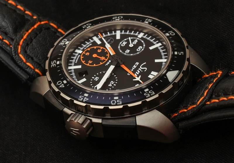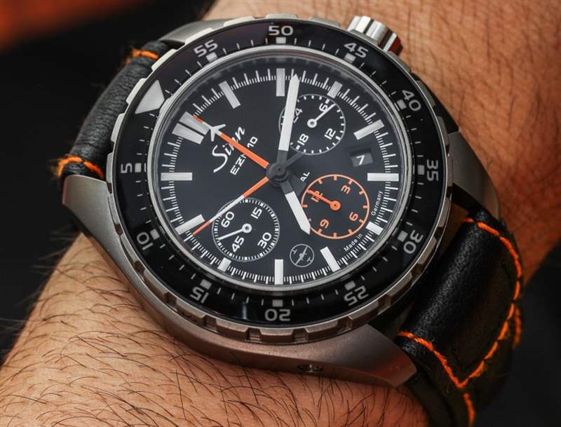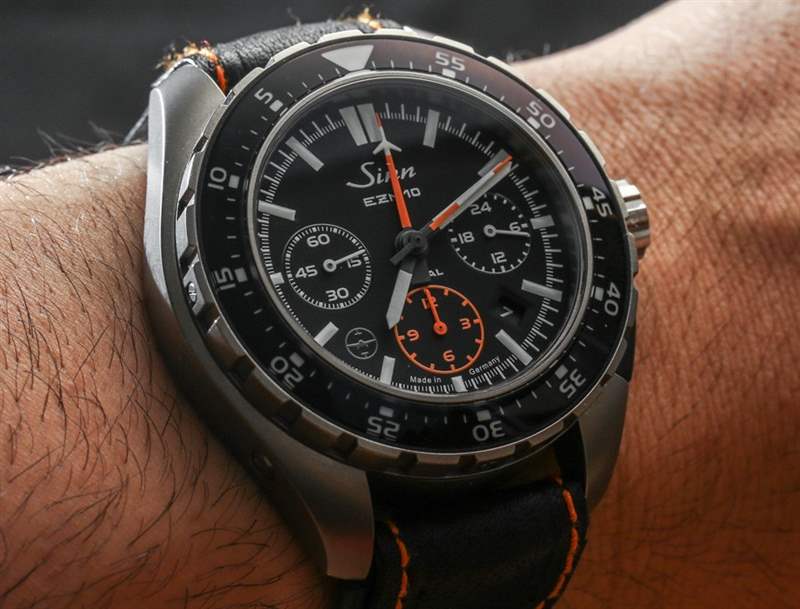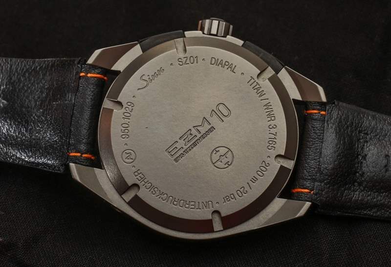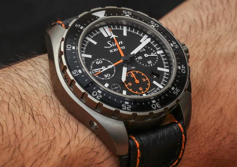 EZM 10 如此成功的部分原因是完全沒有額外的元素,沒有反光表面,以及選擇合適的材料進(jìn)行對(duì)比和強(qiáng)調(diào)的近乎完美的感覺。Sinn 使用橙色作為計(jì)時(shí)指針和計(jì)時(shí)小時(shí)子表盤等其他元素,但除此之外一切都是簡單的單色。戴上鈦金屬表鏈,更像是一只“工具表”。帶襯墊的厚皮表帶舒適且質(zhì)量上乘,但您并不總是想佩戴鮮艷的橙色表帶。這就是為什么我強(qiáng)烈建議您也選擇鈦手鐲,這是一個(gè)額外的購買選項(xiàng)。