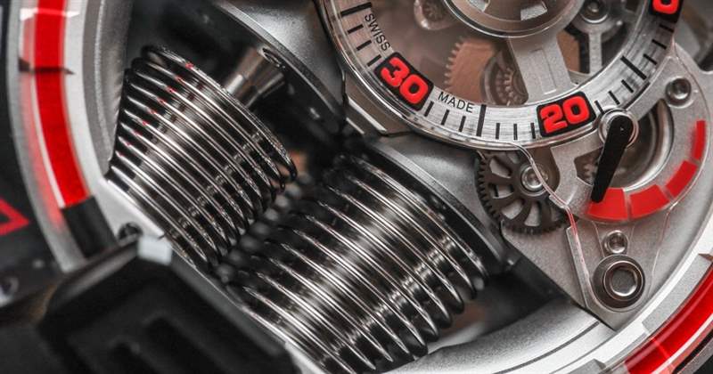 這款 HYT H4 Gotham 在專門開發(fā)的管子和波紋管系統(tǒng)中使用紅色液體來指示小時。表盤上更傳統(tǒng)的指針指示分鐘,而它的兩側(cè)分別是左側(cè)的小秒盤和右側(cè)的動力儲存指示器。并不是說 H1 手表的機芯完全沒有鏤空,而是 HYT H4 的機芯提升了一個檔次,藍寶石水晶板在一些機芯橋上起到了表盤的大部分作用。