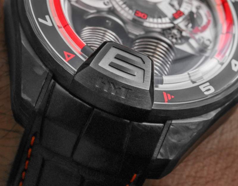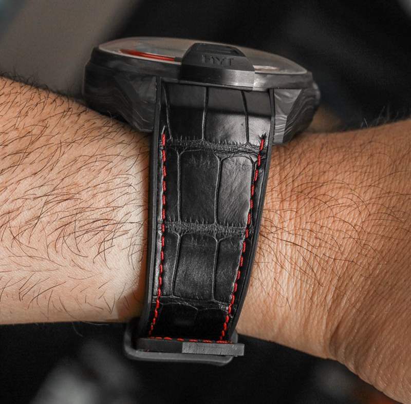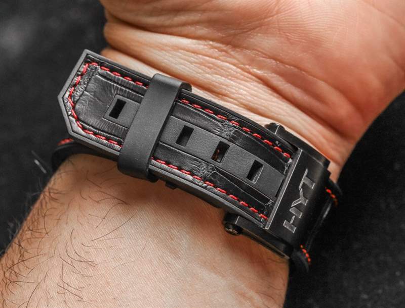 雖然表帶看起來和感覺都非常好,但它有一個鱷魚圖案(盡管它是橡膠的)。我實際上非常喜歡表帶的外觀,但我仍然覺得,當你談?wù)撨@樣的價格時,你永遠不應(yīng)該擁有任何看起來像鱷魚皮/短吻鱷魚皮的東西。要么使用真正的鱷魚皮表帶,要么使用其他具有特殊紋理圖案的表帶。否則,就合成表帶材料而言,我真的很喜歡表帶。哦,我希望有第二個環(huán)用于多余的表帶,因為當像我這樣手腕較小的人佩戴 HYT H4 時,表帶會伸出一點。更新:根據(jù) HYT 的說法,此處手表上看到的表帶不是最終表帶,當 H4 手表發(fā)貨給客戶時會更新為不同的表帶。