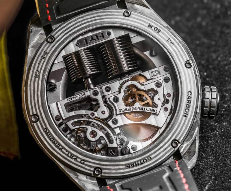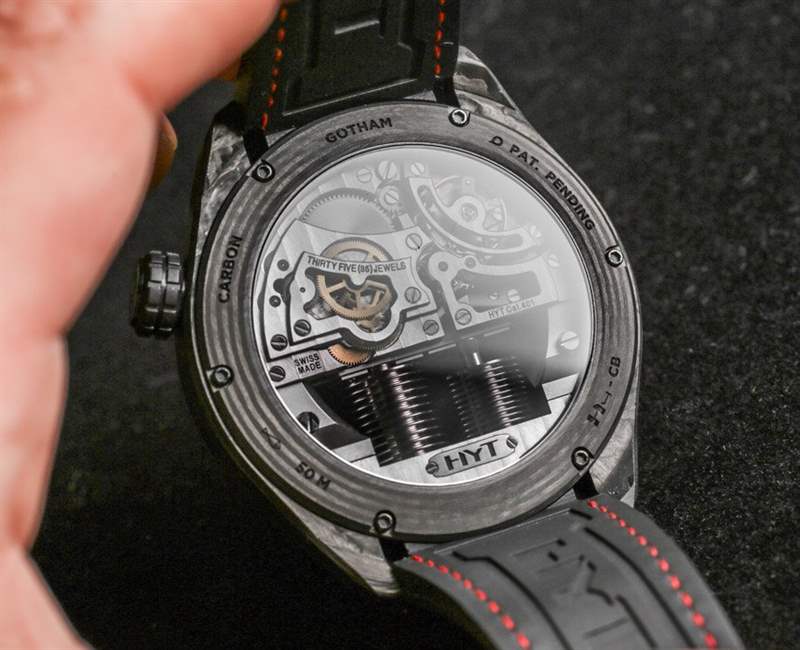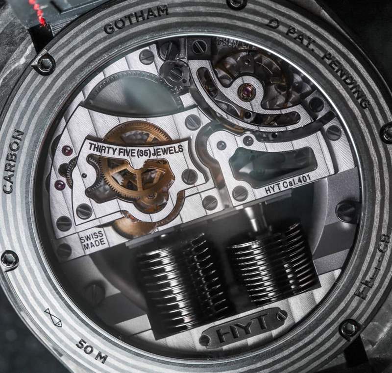 除了 3DTP 碳表殼外,還有其他材料,如藍寶石水晶和 DLC 涂層黑鈦元素(如表冠)。表殼防水深度達 50 米,表冠當然可以擰緊。HYT H4 手表機芯(相對于 H1)的許多新鏤空結(jié)構(gòu)都位于從表殼背面??看到的機芯背面。鏤空效果非常好,但不幸的是,考慮到 HYT H4 Gotham 手表的深色,有點難以看清。我有一種感覺,在未來的模型中,HYT 會少一點挑逗機芯的視覺吸引力。