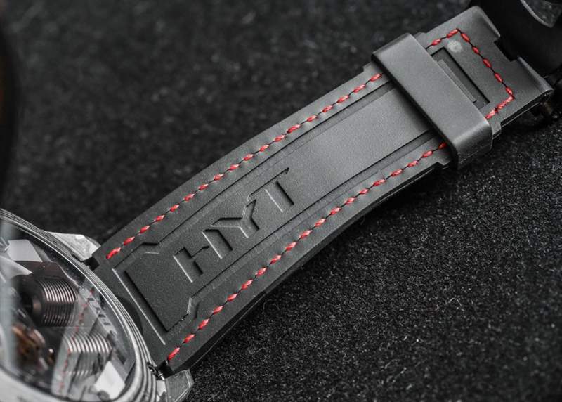 HYT H4 表殼附有一條黑色橡膠表帶,中心采用 Nomex 織物。折疊扣也是鍍有 DLC 涂層的黑鈦金屬。說到帶扣,至少在我的評測表中,它需要用很大的力才能合上才能安全扣合。然而,這很可能是一個原型單元,上面的帶扣通常是預(yù)生產(chǎn)的,其中有一些扭結(jié)。