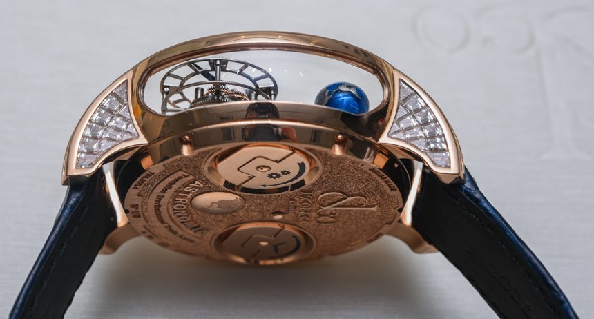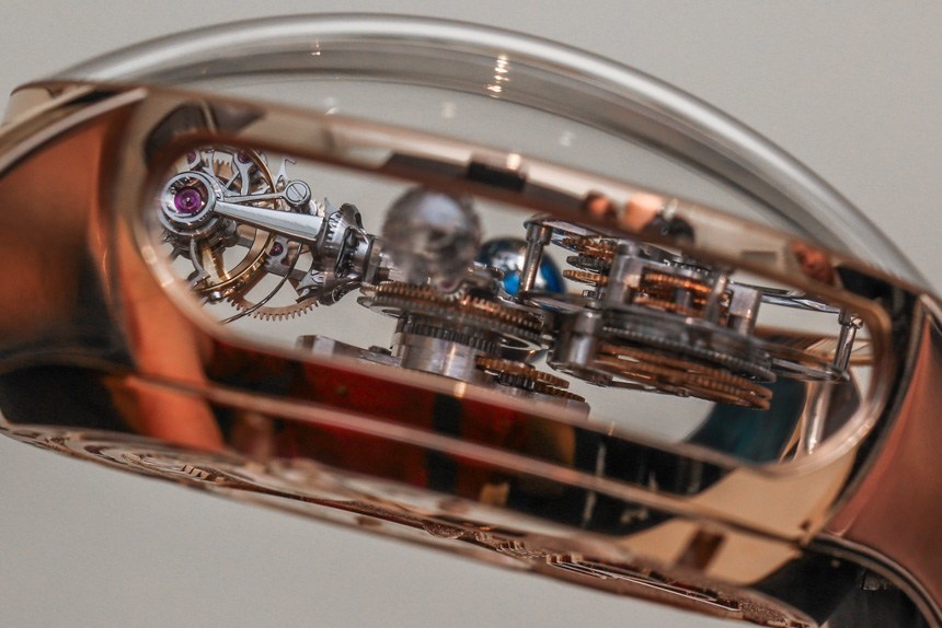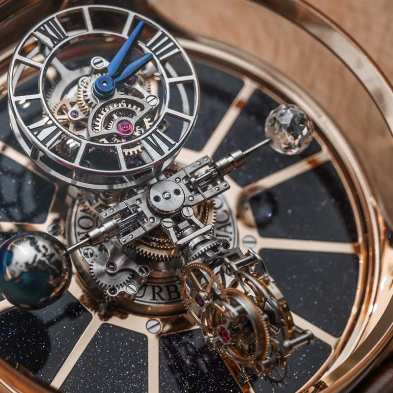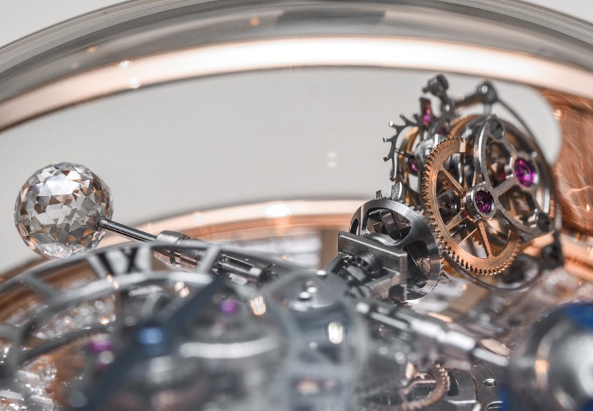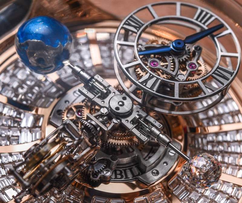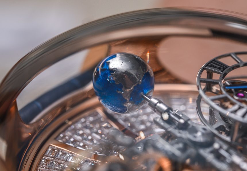 陀飛輪系統本身還有另外兩個軸點,每 60 秒旋轉一圈,然后每 5 分鐘轉向不同的方向。陀飛輪對面是一個時間表盤,它非常酷,因為無論它圍繞表盤旋轉到哪里,它都指向直立。我就是喜歡那個。然后是帶有微型手繪鈦球體的手臂,在它的對面是一顆“Jacob 切割”鉆石,該鉆石采用 Jacob & Co. 獨有的注冊工藝,使鉆石具有球形表殼和 288 個刻面。地球儀和鉆石迪斯科球每 60 秒旋轉一圈。