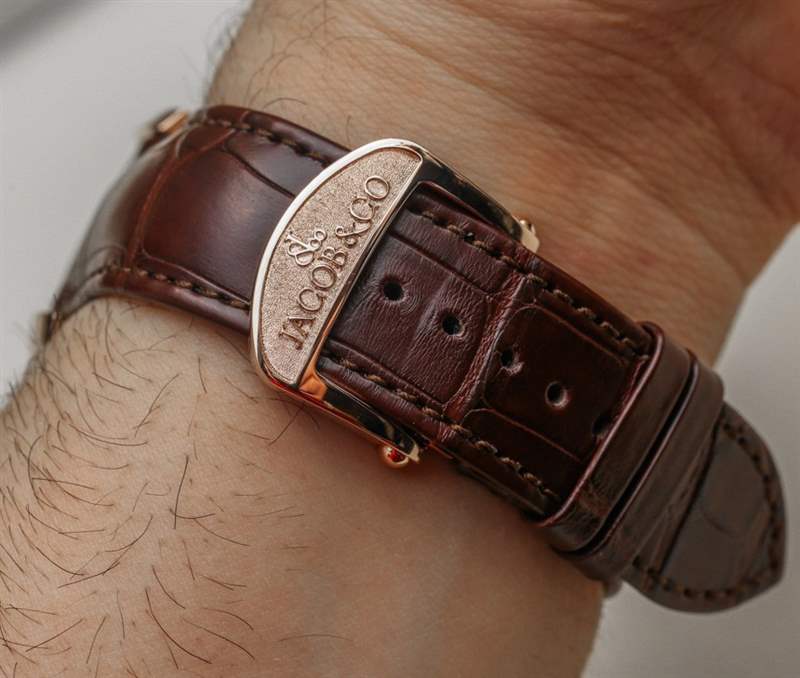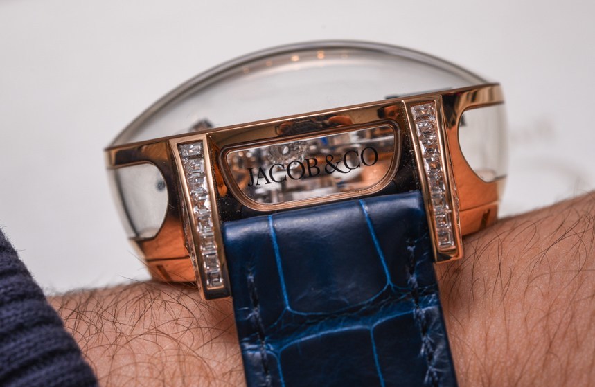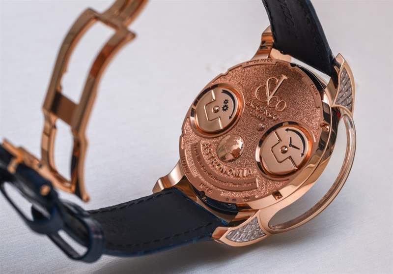 Jacob & Co. Astronomia Tourbillon 表殼寬 50 毫米,厚 25 毫米,由 18k 玫瑰金制成,上面覆蓋著非常漂亮的 AR 涂層藍寶石水晶。雖然不是每個人都可能“得到”Jacob & Co. Astronomia,但您可以看出設計精心策劃。要操作手表或給它上弦,底蓋上有兩個折疊的“鑰匙”。和 Jacob & Co. Astronomia Tourbillon 一樣大,戴在手腕上也非常舒適。也就是說,直到您不小心將其撞到墻壁或桌子上。