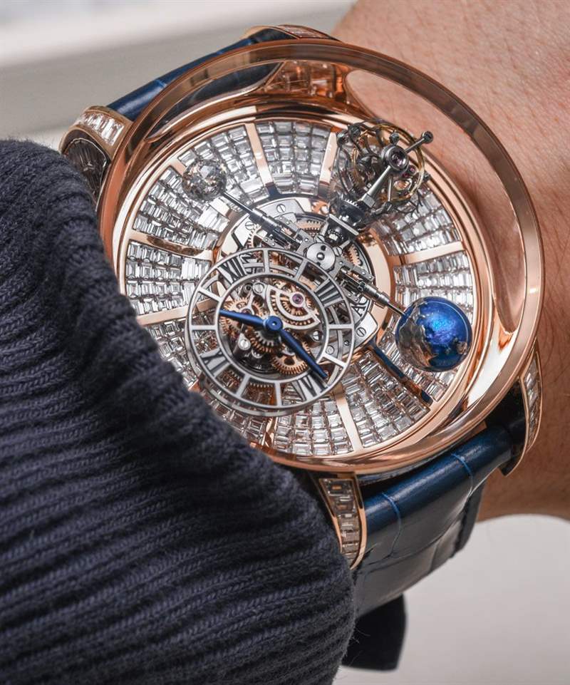 所有這些旋轉和移動的意義何在?當然是充當“催眠編舞”;這一切都與視覺上的輝煌有關(并且有效)。所以就像我說的,如果你對 Jacob & Co. Astronomia Tourbillon 想得太多,你會一直問“為什么?” 這不是為什么,僅僅是因為它很酷而且他們可以。當您成為 Jacob & Co. 的客戶時,您不想聽到有關運轉中的天文館和數學方程式的信息——您想要眼花繚亂、獲得娛樂并提醒您自己很特別。佩戴 Jacob & Co. Astronomia Tourbillon 的任何人都是“特別的”。