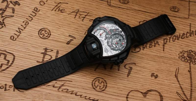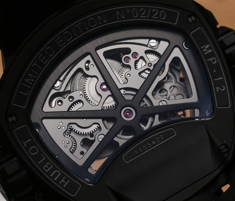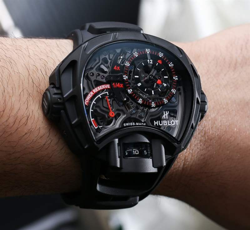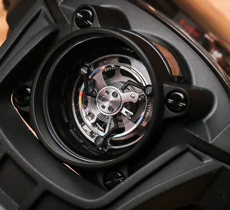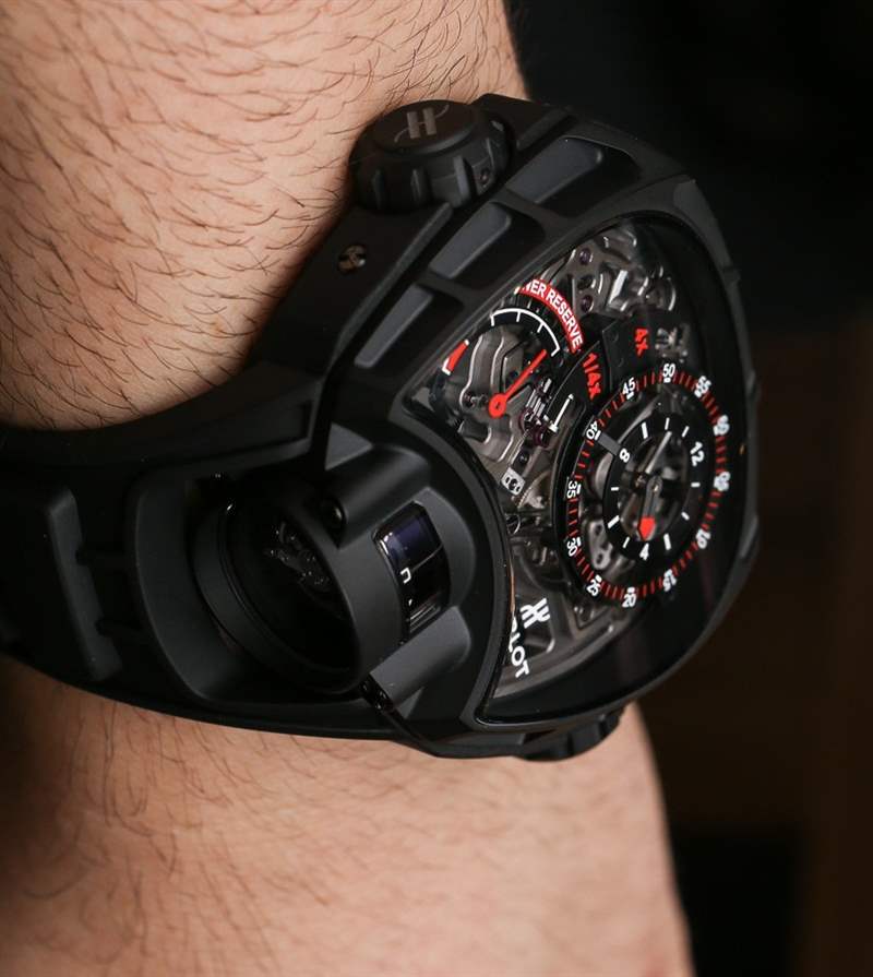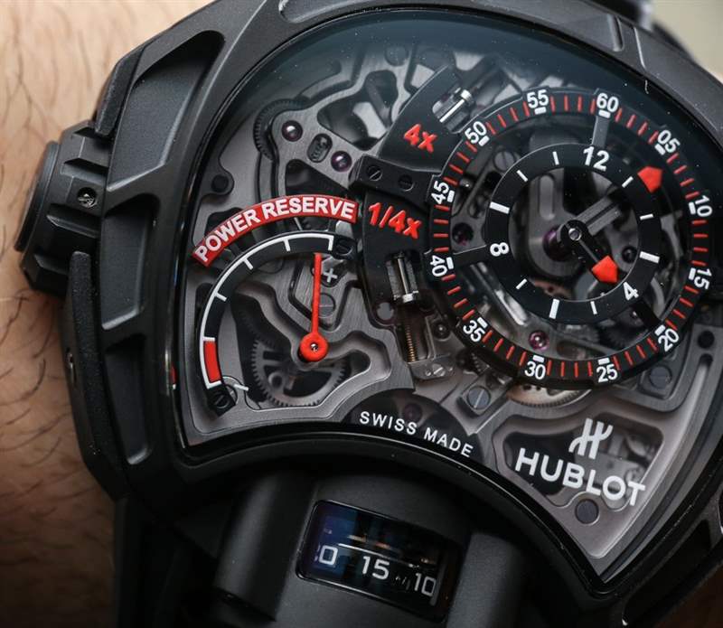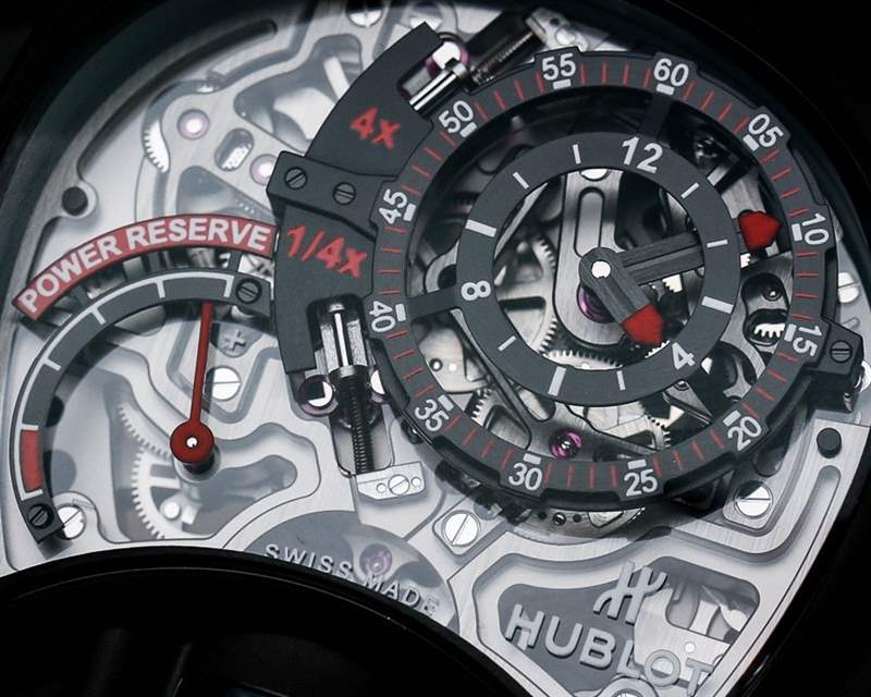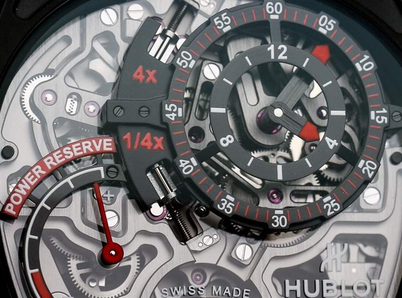 與 Hublot MP-12 Key of Time 一樣,(后來生產的)Hublot MP-05 LaFerrari 手表有一個垂直方向的陀飛輪,從表殼的下側可以看到。雖然你可以不同意,但在我看來,Hublot MP-05 LaFerrari 和 Hublot MP-12 Key Of Time 手表是近親。那么,Hublot MP-12 Key Of Time 手表的奇特復雜功能又是什么呢?該機芯能夠將時間顯示為加速四倍或減慢四倍。這意味著您可以將手表設置為在僅經過 1 分鐘后顯示 4 分鐘已經過去……或者在實際經過 1 分鐘后顯示僅經過 15 秒。