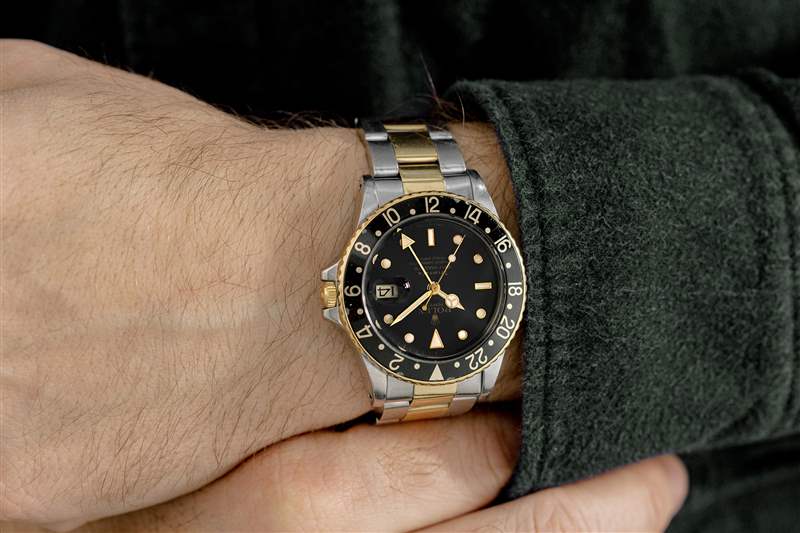 一個星期五,下午6點15分,寫這篇文章的時候,我的內心有些糾結:我喜歡這只表嗎?我又回到了我的雙色手表難題:它不完全是金,也不完全是鋼,感覺它試圖成為一切,但又不完全。在我看來,尤其是雙音 GMT,因為多年來我一直在導師的手腕上看到它;本能地,它最好屬于一位紳士的手腕,他贏得了自信,可以毫不費力地穿上一件帶有金色紐扣的雙排扣海軍藍色夾克。不知怎的,我覺得我還沒有資格戴這塊表。但是在看了這個例子并長時間停頓之后(是的,我有想得太多的傾向),我決定是時候回過頭來擁抱這個半金半鋼的創作了。我喜歡表盤上有簽名“