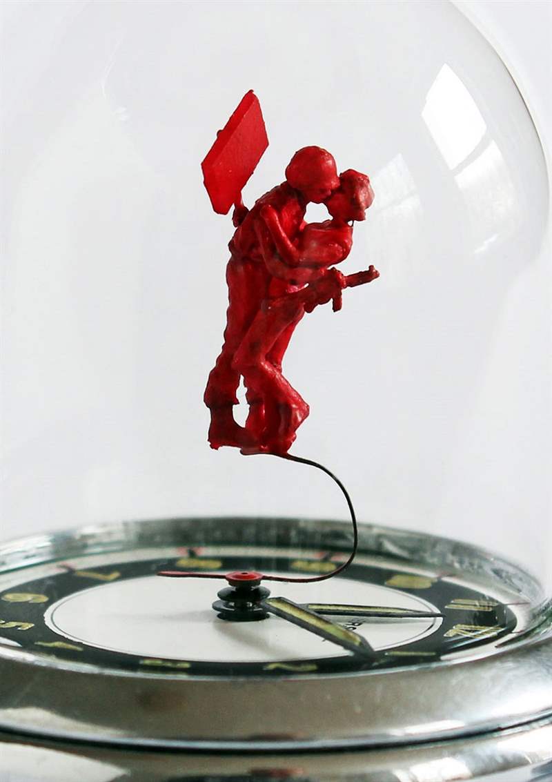 頂部的作品被稱為“Watch Sweeper”,有一個看門人清掃手表指針,因為看門人自己附在一只移動的手表指針上。下面是一段視頻,展示了各種手表雕塑的動作,然后是“年輕素食者的歷險記”,其中有一個屠夫在一個年輕女孩的手中拿著一把屠刀,還有一頭豬被圍繞表盤旋轉(zhuǎn)的氣球高高舉起。在下方,您會看到一名士兵在名為“愛與抗議”的作品中親吻一名戰(zhàn)爭抗議者。