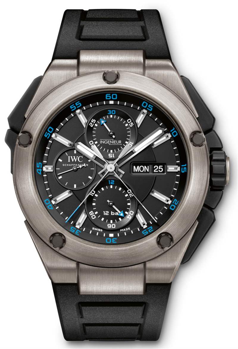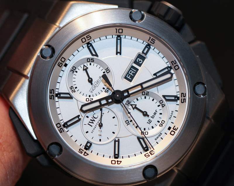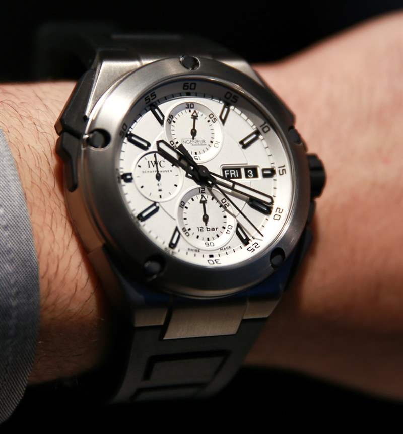 IWC 萬(wàn)國(guó)表為 Ingenieur Double Chronograph Titanium 提供兩種表盤(pán)顏色。一個(gè)是黑色和藍(lán)色調(diào),但我們一直被“鍍銀”色調(diào)的表盤(pán)所吸引。雖然不完全是白色,但它幾乎是白色的運(yùn)動(dòng)手表表盤(pán)——我們喜歡它們。在我們對(duì) Porsche Design Flat Six P’6310 手表的評(píng)測(cè)中,我們討論了生產(chǎn)輕型表盤(pán)運(yùn)動(dòng)手表的困難,以及如何取得成功。關(guān)鍵是正確的黑色材料和缺乏反射率。粗輪廓的黑色指針和應(yīng)用的小時(shí)指示器很好地執(zhí)行了這一點(diǎn)。雖然表盤(pán)帶有一絲光澤,但工程師雙人計(jì)時(shí)碼表鈦金屬表盤(pán)上的所有指示器都以美麗的樂(lè)器風(fēng)格脫穎而出。