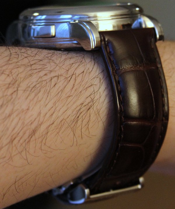 Nicolas Rieussec表殼寬43毫米,高14.8毫米。它不是一塊小手表,但它確實(shí)像中型手表一樣佩戴。高度彎曲的凸耳在視覺上降低了它的高度。前后水晶均為藍(lán)寶石(前水晶有雙AR涂層),防水深度達(dá)30米。