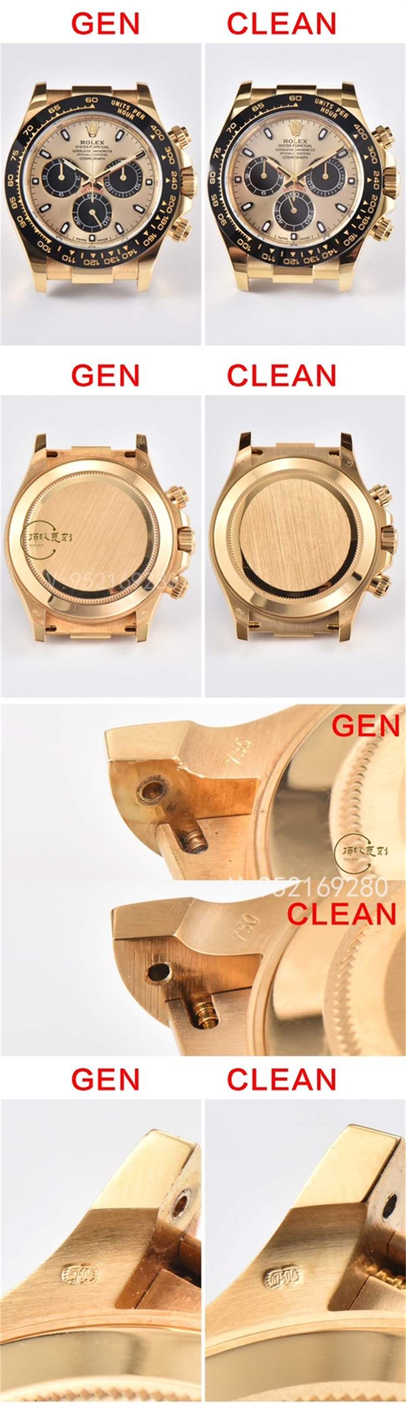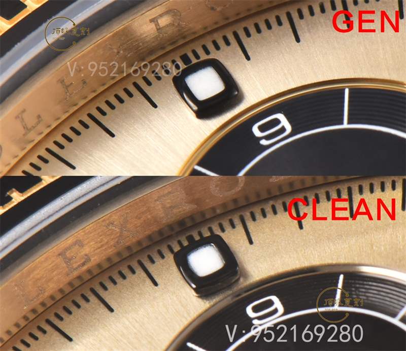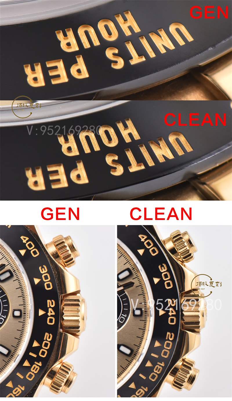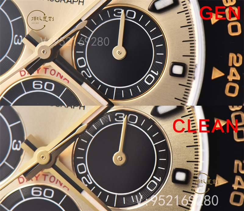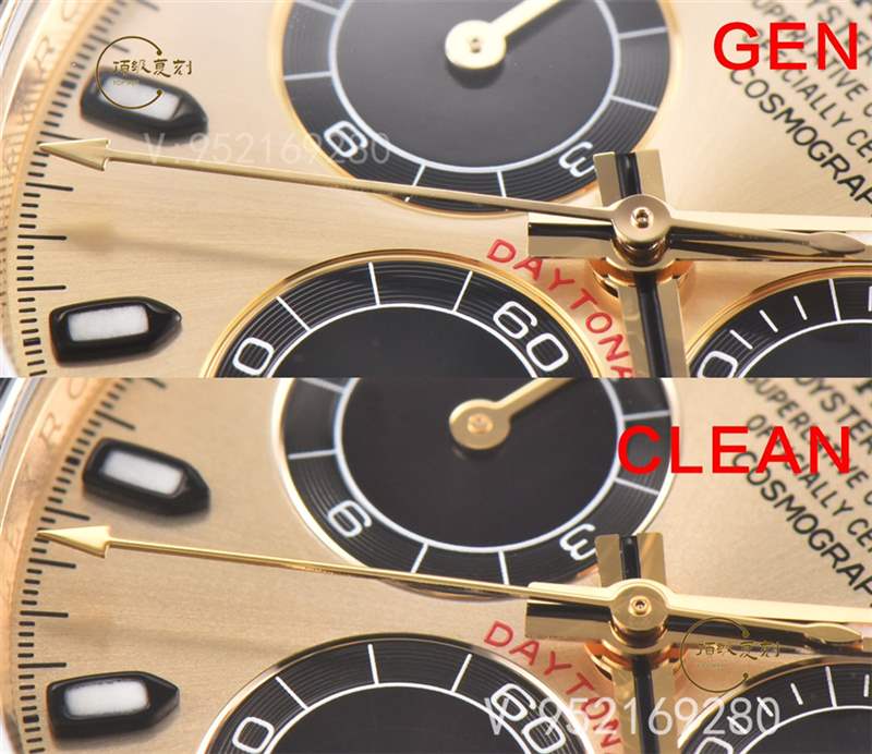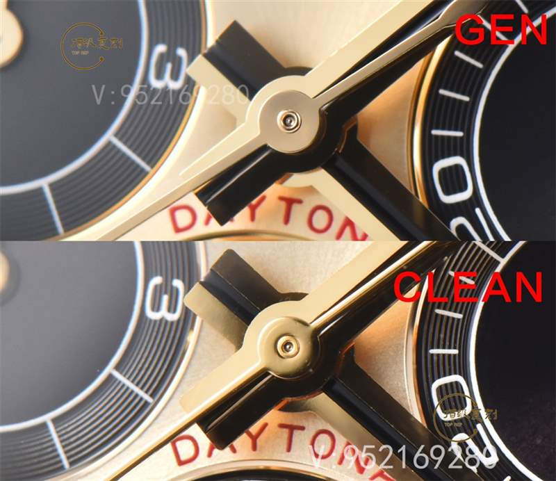 在字面方面來說,此次CLEAN廠進行了重新定義,顏色方面也是極致的達到金色為主,同時對于顏色方面也是進行了真空pvd電鍍,并非普通的噴油調色,pvd好處在于電鍍層可以控制在2-4um微米。不以及計時小眼圈的中間黑色大陽紋以及邊緣d紋完全按照真品一比一開模,對于整體細節方面也是做的很靠譜!手表的表面顏色非常接近于原來的細節!