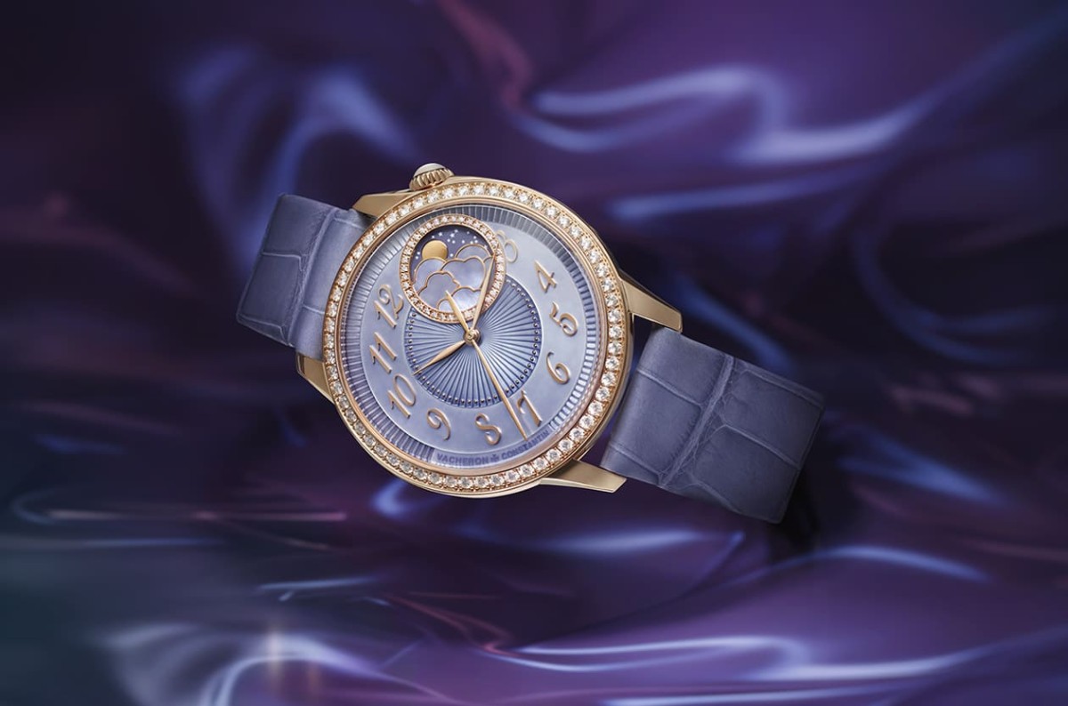 égérie月相腕表采用色澤溫潤亮麗的18K 5N粉紅金打造,37mm的大器表殼另于表圈鑲上58顆圓鉆,而罕見置于2點方向的表冠上則鑲有一顆凸圓形月光石輝映腕表的復雜功能。 由表帶延伸進面盤的丁香紫色調靈感來自殷亦晴的高訂時裝作品風格,例如他會以銀紫色面料疊搭淺丁香紫色或云紋紫色詮釋一種柔美縹縹的幻夢美感。 此外腕表面盤中央與邊緣出現的褶皺紋飾也和設計師服裝作品常塑造的疊褶和垂墜效果呼應,江詩丹頓精選出丁香紫色珍珠母貝,并精細于脆弱的珍珠母貝表面雕琢出一道道放射狀條紋形成褶皺感。 令人驚艷的是,品牌還在褶皺紋飾的末端一一以手工鑲上金質珠粒,密致的排列剛好能作為判讀分鐘的刻度。 這款égérie月相腕表連與表冠同方向的月相顯示也以丁香紫色珍珠母貝制作,搭配金質月亮隨著運轉周期呈現陰晴圓缺,月相盤周圍另鑲嵌上34顆美鉆閃閃動人,將紫色的魅力直送進佩戴者眼簾,一股飄然輕柔的美感油然而生。 值得一提的是,腕表的透明底蓋邊緣特別鐫刻上設計師的英文名稱以及每一只腕表的限量編號,讓人在欣賞1088 L機芯組件的精致作工之外,還能感受到腕表珍稀可貴的意義,江詩丹頓甚至也替腕表導入表帶快拆系統,除了丁香紫色鱷魚皮表帶,還有同由殷亦晴設計的夜空藍緞面效果小牛皮和粉紅色粒面小牛皮表帶可供表主隨性更換。